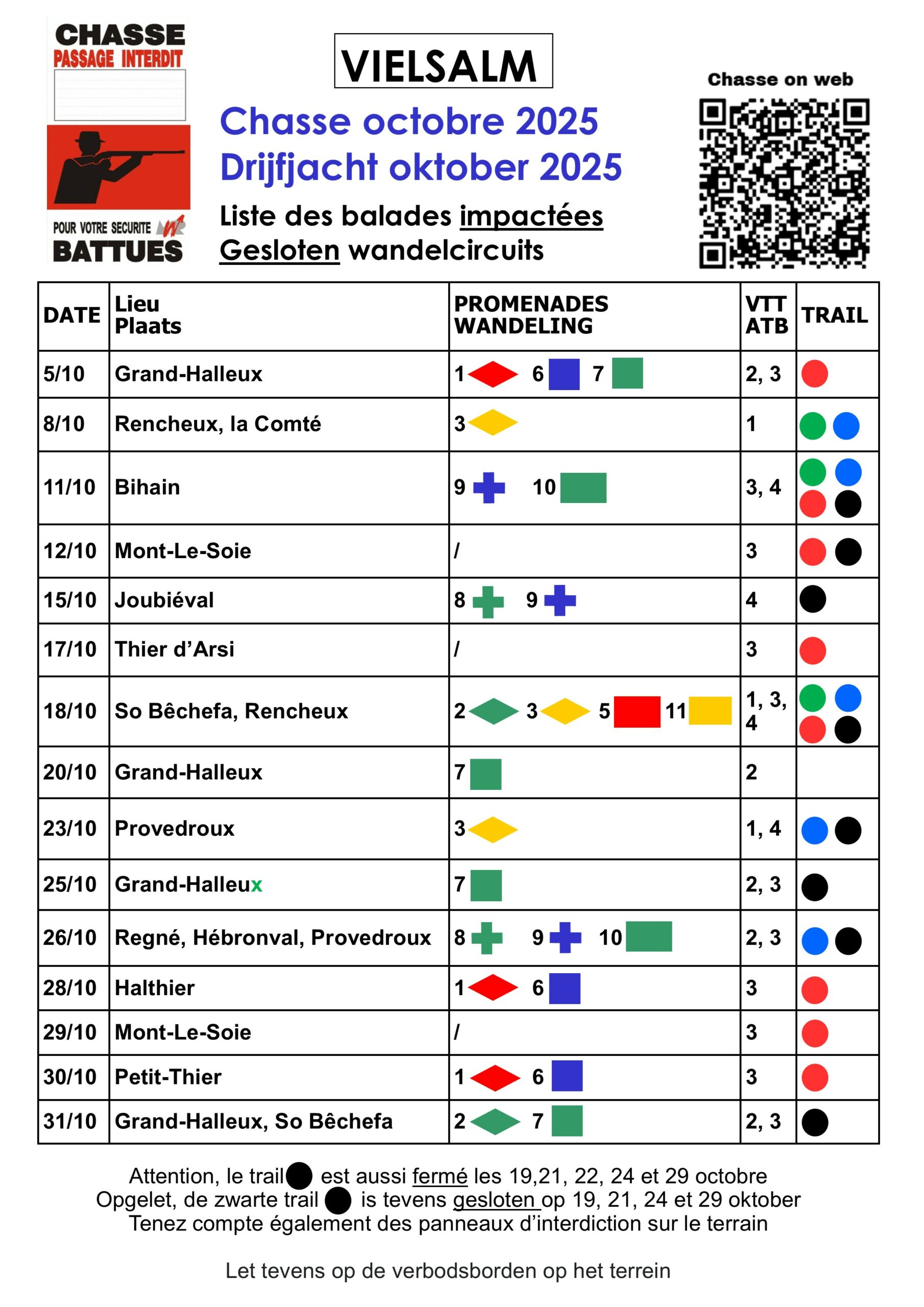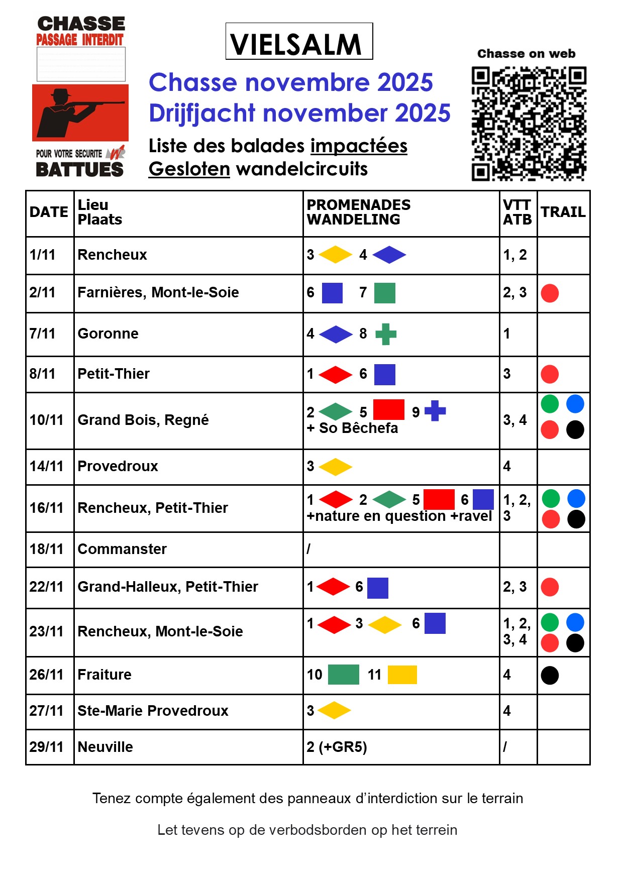 La chasse se déroule d’octobre à décembre. Voici la liste des promenades impactées par la chasse aux mois d’octobre – novembre 2025. Les numéros de promenades sont ceux indiqués sur la carte de promenades de Vielsalm.